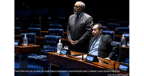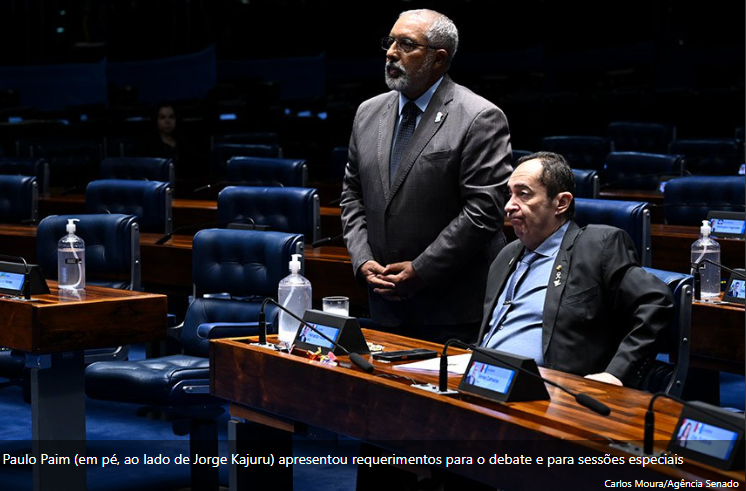 Paulo Paim (em pé, ao lado de Jorge Kajuru) apresentou requerimentos para o debate e para sessões especiais